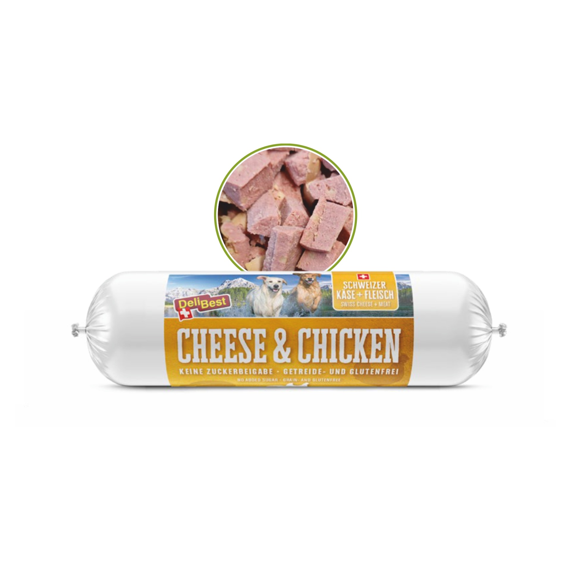 Složení: 88 % kuřecího masa ze švýcarského chovu, 7 % švýcarského sýra, 4 % bramborového škrobu, 1 % minerálů.